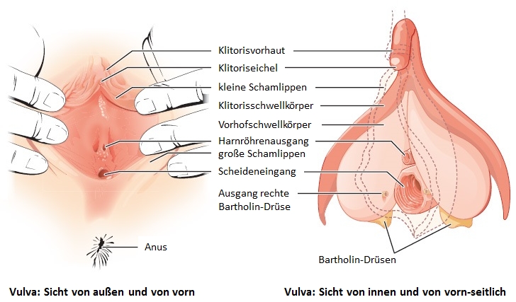 wie Venushügel, die großen äußeren Schamlippen, die kleinen inneren Schamlippen, die Klitoris und